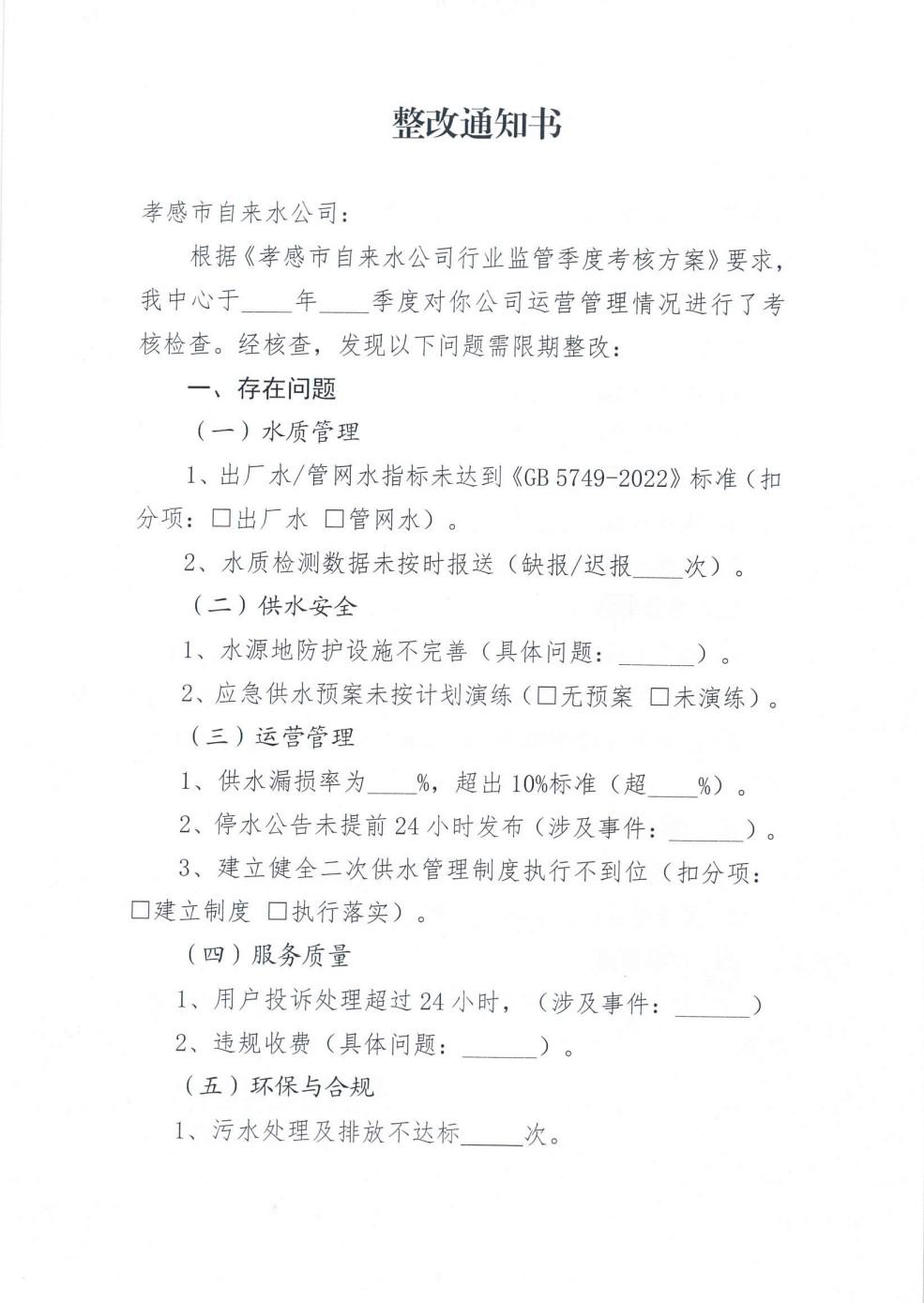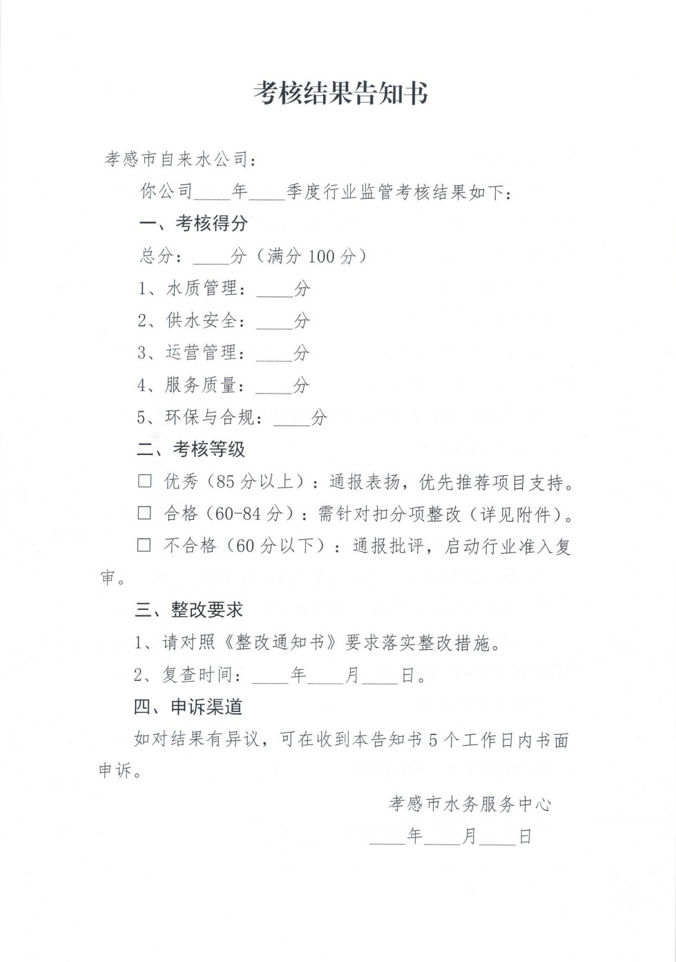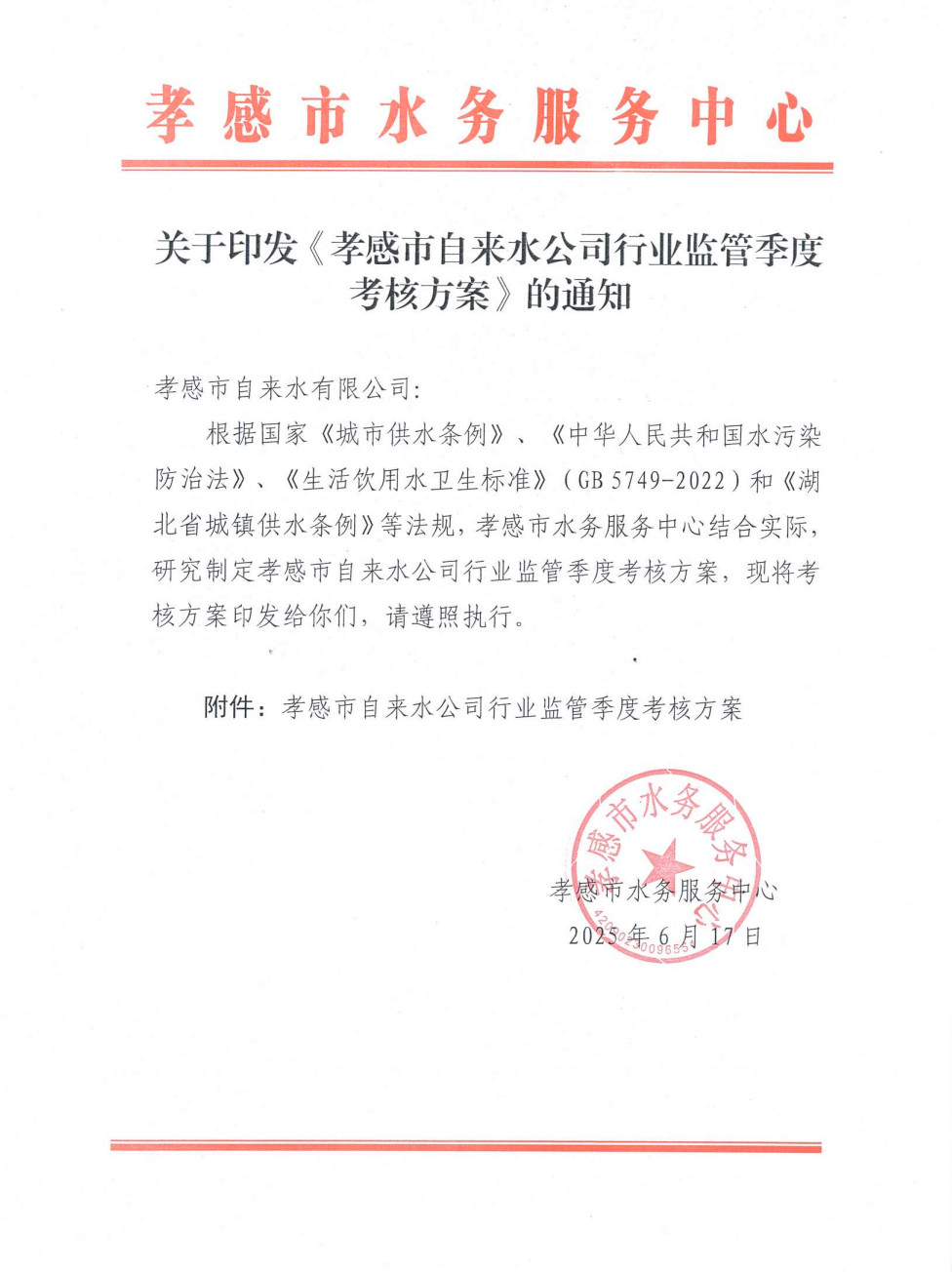 關于印發《孝感市自來水公司行業監管季度考核方案》的通知