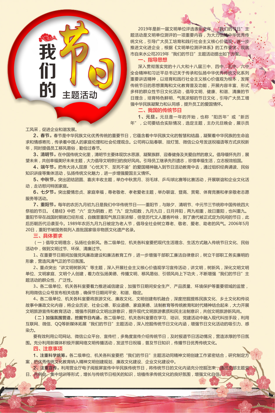 2019年是新一屆文明單位評選表彰之年,“我們的節(jié)日”主題活動是文明單位測評的一項重要內(nèi)容,為大力弘揚中華優(yōu)秀傳統(tǒng)文化,引導廣大員工培育和踐行社會主義核心價值觀,進一步推進文化進企業(yè),根據(jù)《文明單位測評體系》的工作要求,現(xiàn)就市自來水公司2019年“我們的節(jié)日”主題活動提出如下方案。